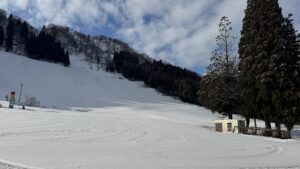 なんと!今日は快晴です!圧雪した斜面にうっすらと雪が積った最高のコンディション!